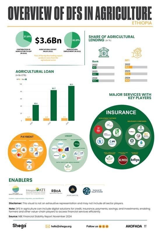 Digital Financial Services is serving the agricultural sector by providing credit, insurance, and payment solutions through key players from the private sector, government, and development partners. However, given the agriculture sector's major contribution to the economy, there is still a need for further expansion and enhancement to better support the sector. Check out the latest visual by AKOFADA (Advancing Knowledge on Financial Accessibility and DFS Adoption), our initiative for bolstering the accessibility of information on DFS (digital financial services) in Ethiopia.