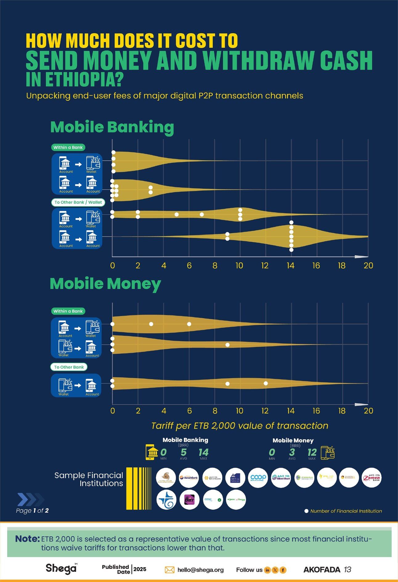 Our latest visual under AKOFADA (Advancing Knowledge on Financial Accessibility and DFS Adoption) breaks down 𝗛𝗼𝘄 𝗠𝘂𝗰𝗵 𝗜𝘁 𝗖𝗼𝘀𝘁𝘀 𝘁𝗼 𝗦𝗲𝗻𝗱 𝗠𝗼𝗻𝗲𝘆 𝗮𝗻𝗱 𝗪𝗶𝘁𝗵𝗱𝗿𝗮𝘄 𝗖𝗮𝘀𝗵 𝗶𝗻 𝗘𝘁𝗵𝗶𝗼𝗽𝗶𝗮 helping stakeholders and policymakers understand the true cost users pay when adopting digital services. Lower fees can unlock greater access, especially for underserved communities. Visit DFS Hub Ethiopia to download the high-resolution visual: https://digitalfinance.shega.co/insights/infographics
