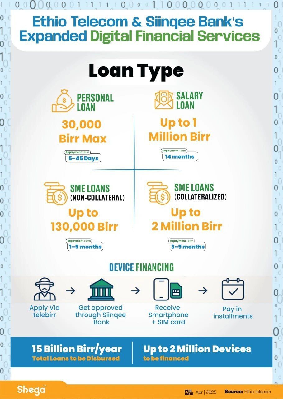 Now, a bold shift is underway, led by a new bank that emerged from a micro-finance institution. Last week, Siinqee Bank and Ethio telecom launched a range of digital financial services through telebirr, offering personal loans of up to 30,000 birr, non-collateral business loans of up to 130,000 birr, and collateral-backed loans reaching as high as 2 million birr.