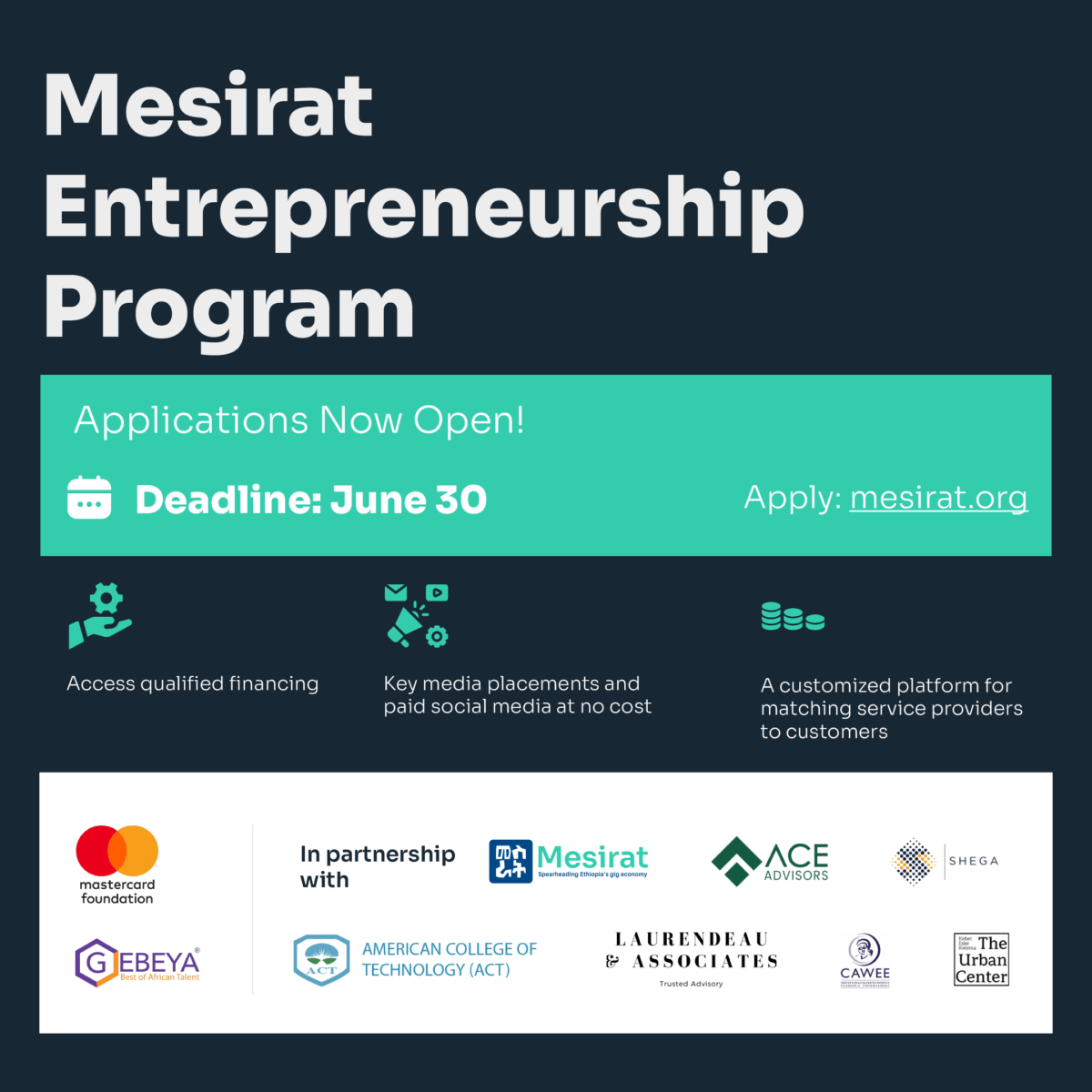 We are excited to announce the Mesirat Entrepreneurship Program, a partnership between the Mastercard Foundation, Gebeya Inc., and consortium partners is cordially inviting you to apply for the Mesirat Entrepreneurship Program.The program will support 100 multi-sided gig and professional marketplaces across Ethiopia, to create opportunities for 1 million highly-skilled workers. As part of this goal, the Mesirat Entrepreneurship Program is offering free resources and support to 100 select business owners looking to build their businesses quickly, at no cost.The program will assist selected entrepreneurs to: